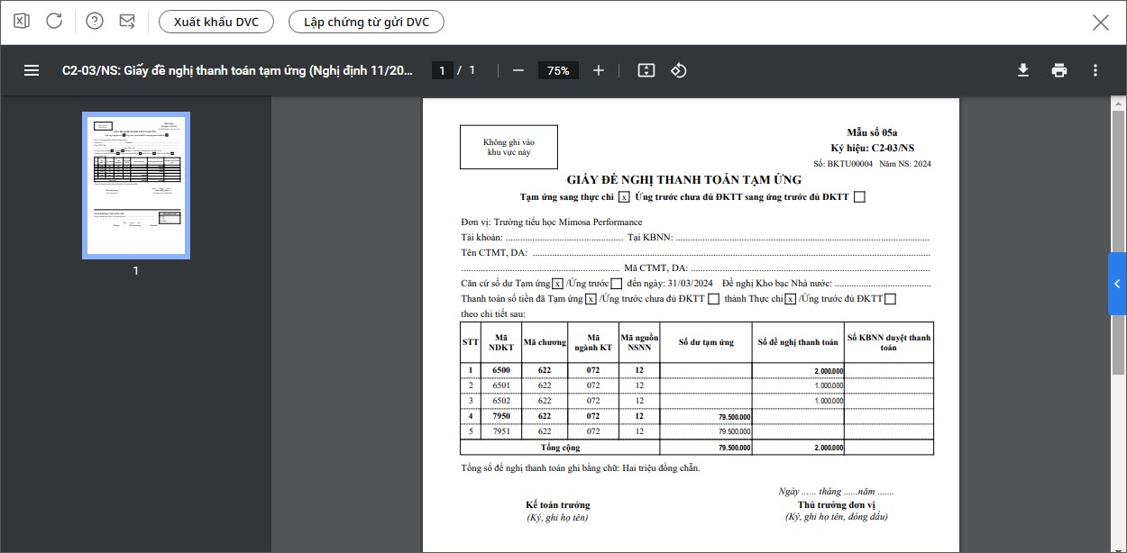 Ví dụ: In mẫu Giấy đề nghị thanh toán tạm ứng (Nghị định 11/2022/NĐ-CP).