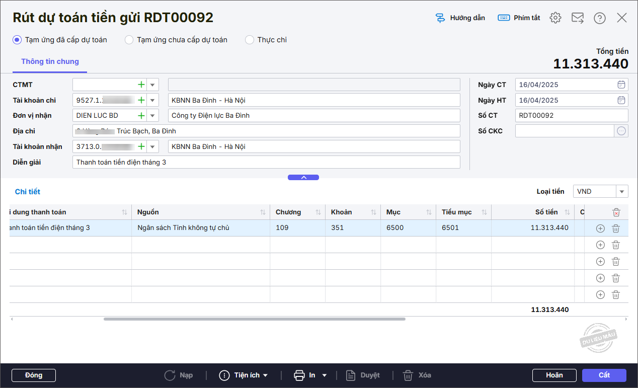- Nhập chi tiết chứng từ: Diễn giải, TK Nợ, Số tiền, Nguồn, Chương, Khoản, Tiểu mục, nghiệp vụ chọn Tạm ứng đã cấp dự toán.