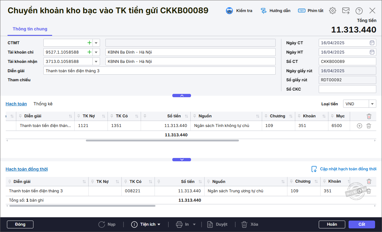 - Kiểm tra lại thông tin trên chứng từ Chuyển khoản kho bạc vào TK tiền gửi được lấy từ chứng từ Rút dự toán tiền gửi sang.