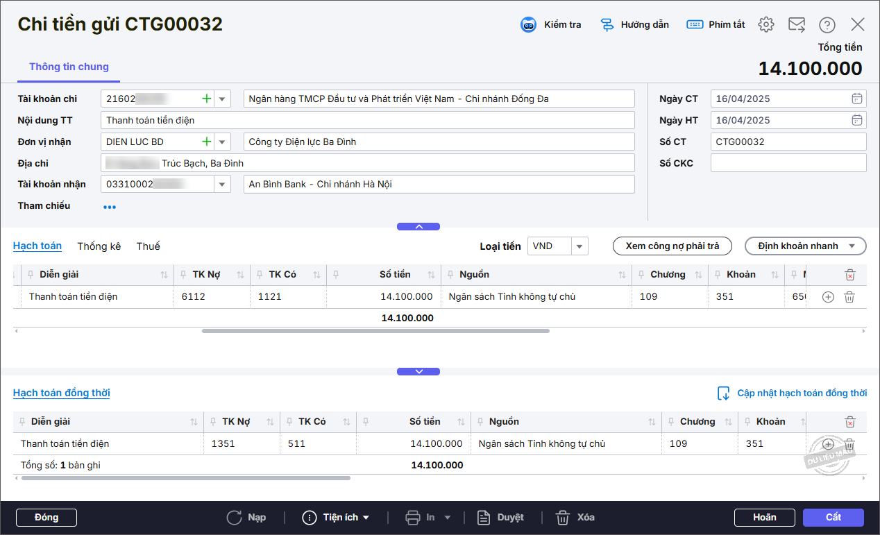 - Nhập thông tin chung: Tài khoản chi, Đơn vị nhận, Tài khoản nhận, Diễn giải.