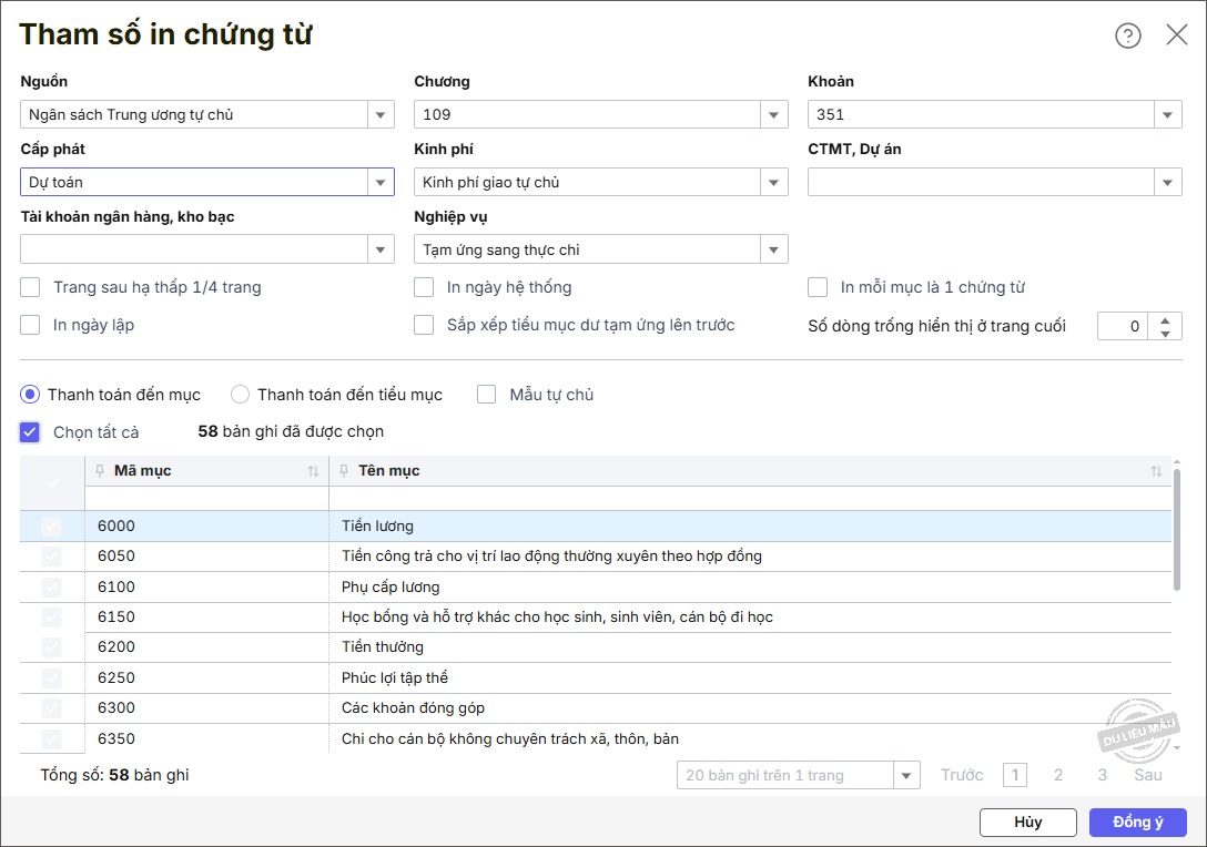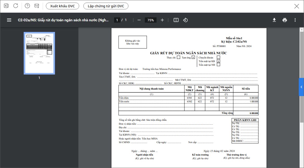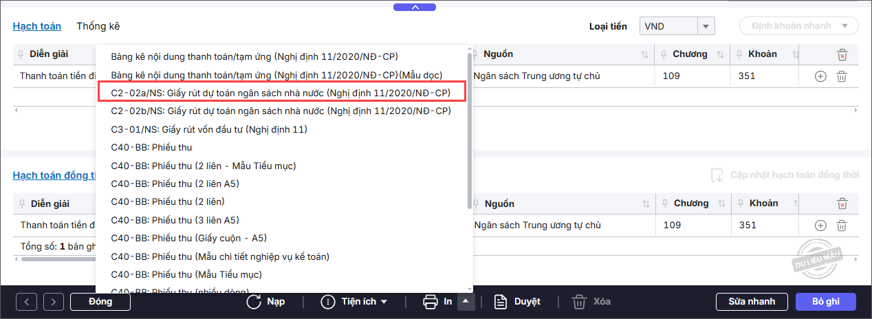 Ví dụ: In mẫu C2/02a: Giấy rút dự toán ngân sách nhà nước (Nghị định 11/2020/NĐ-CP).