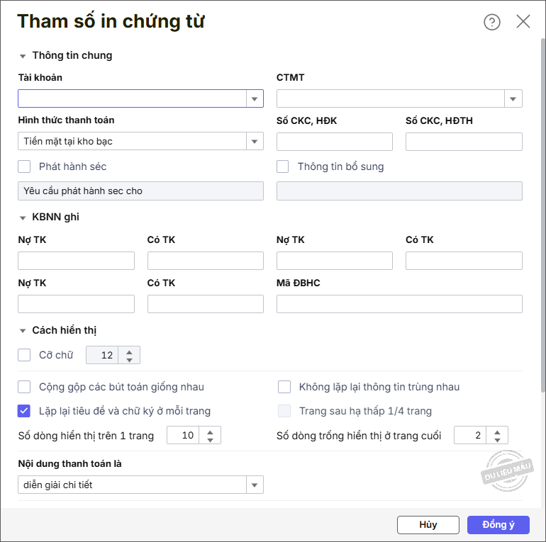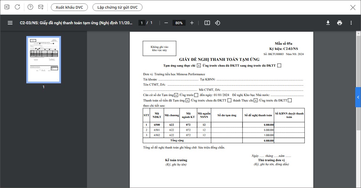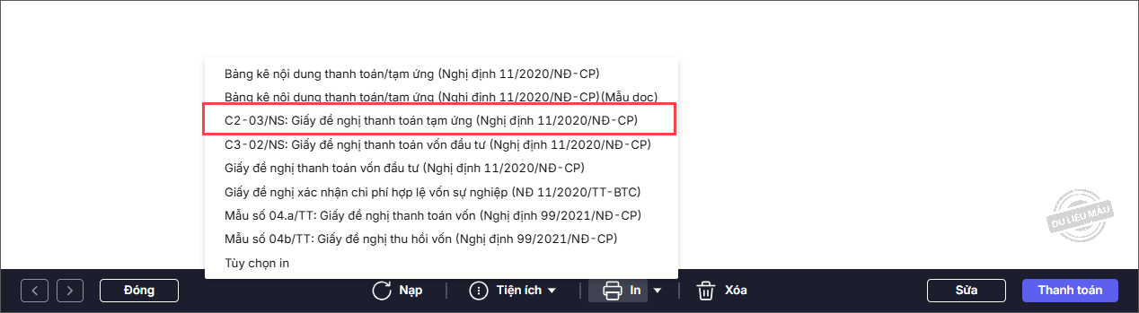 Ví dụ: In mẫu Giấy đề nghị thanh toán tạm ứng (Nghị định 11/2022/NĐ-CP).