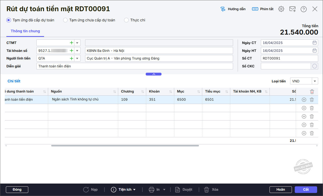 • Nhập thông tin chung: Tài khoản số, Người lĩnh tiền, Diễn giải.
