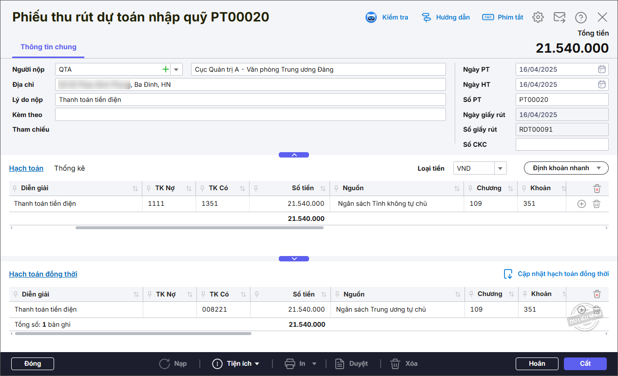 6. Kiểm tra lại thông tin trên Phiếu thu rút dự toán nhập quỹ được lấy từ chứng từ Rút dự toán tiền mặt sang.