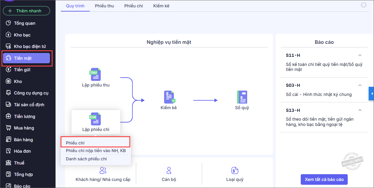 1. Vào nghiệp vụ Tiền mặt, chọn Lập phiếu chi\Phiếu chi.