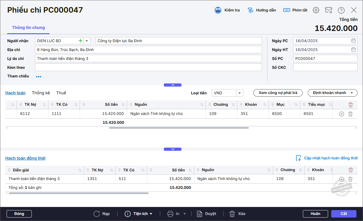 • Nhập thông tin chung: Người nhận, Địa chỉ, Lý do chi.