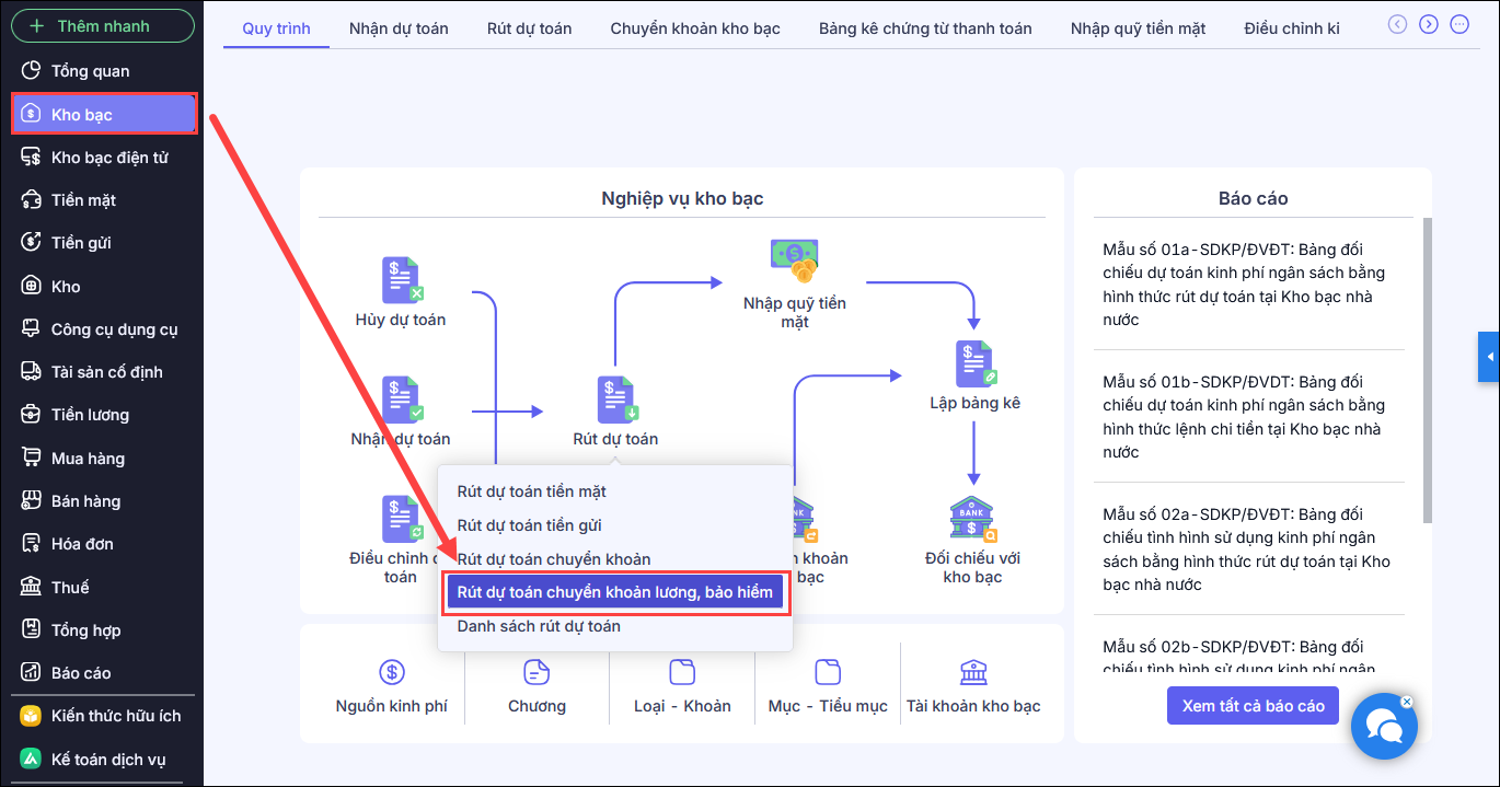 Bước 1: Lập chứng từ rút dự toán1. Vào nghiệp vụ Kho bạc, chọn Rút dự toán\Rút dự toán chuyển khoản lương, bảo hiểm.