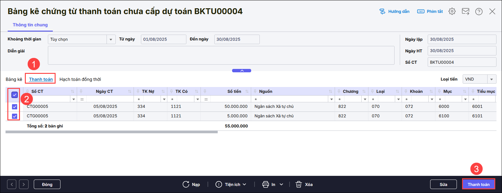 6. Nhấn Cất. Bước 4: Thanh toán tạm ứngSau khi được kho bạc chấp nhận thanh toán: 1. Vào nghiệp vụ Kho bạc\Lập bảng kê\Danh sách bảng kê chứng từ thanh toán. 2. Kích đúp chuột vào bảng kê đã được kho bạc chấp nhận thanh toán. 3. Chọn tab Thanh toán.