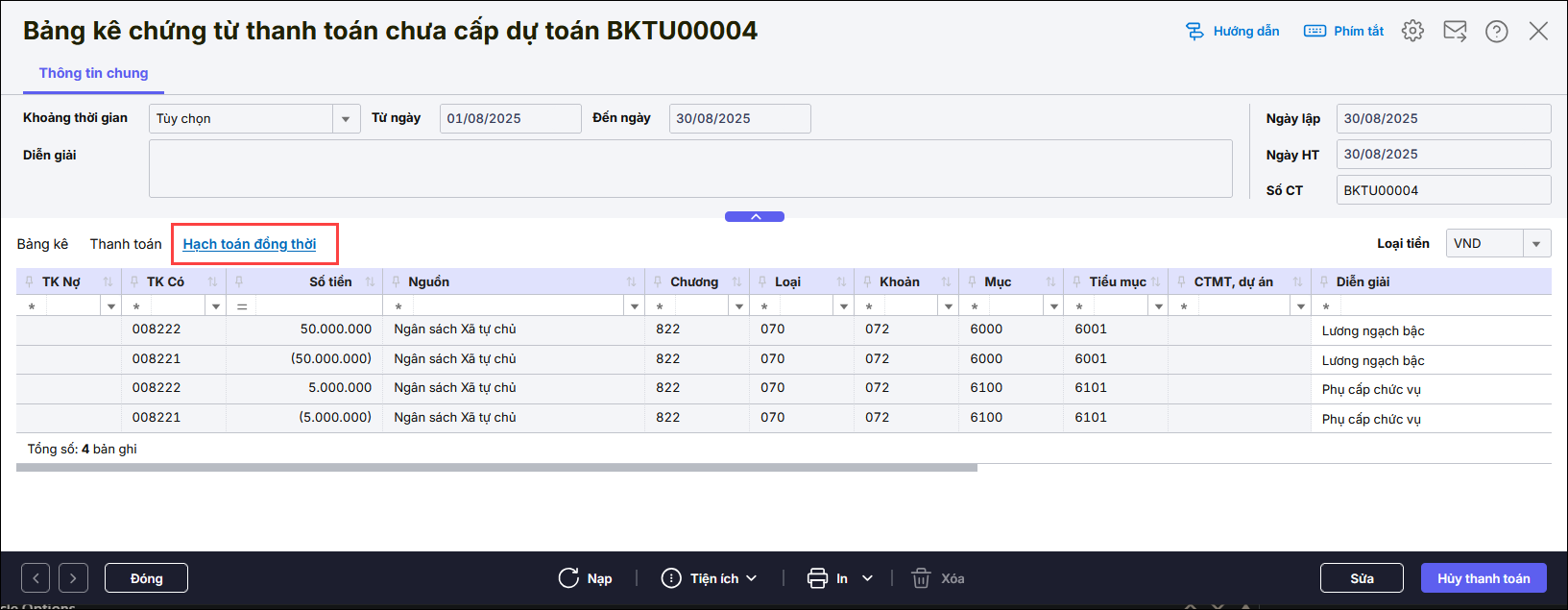 4. Hệ thống tự động sinh chứng từ đồng thời tại tab Hạch toán đồng thời.