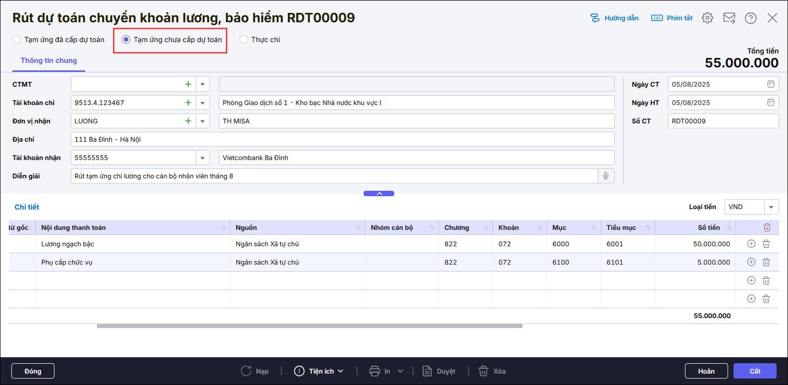 2. Tích chọn Tạm ứng chưa cấp dự toán. 3. Khai báo thông tin về chứng từ Rút dự toán chuyển khoản lương, bảo hiểm.