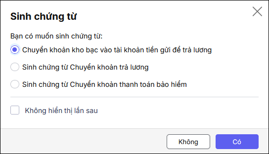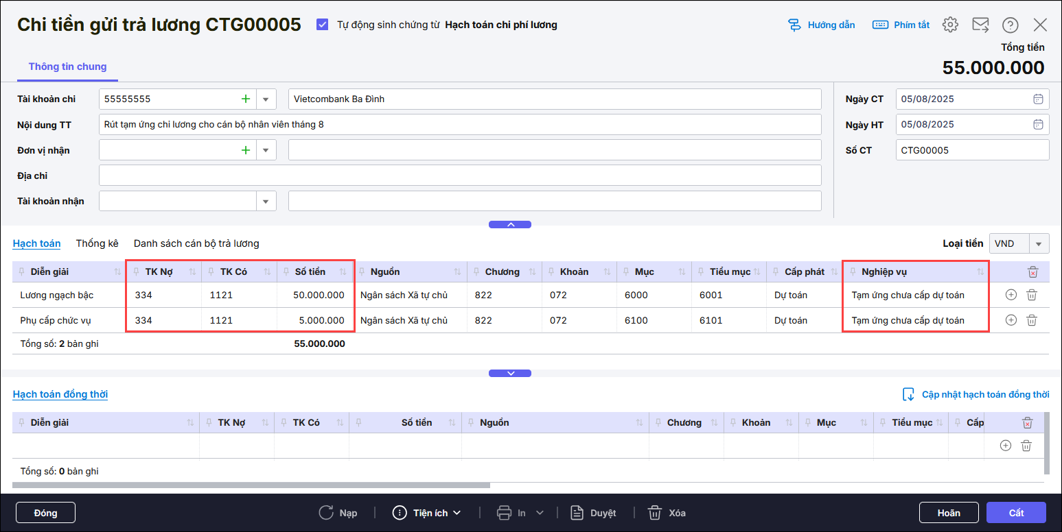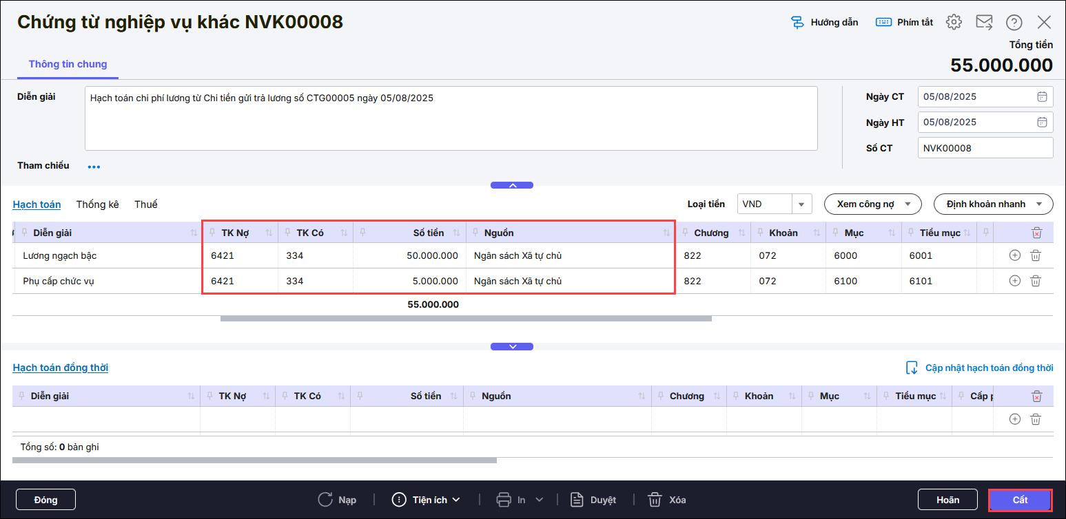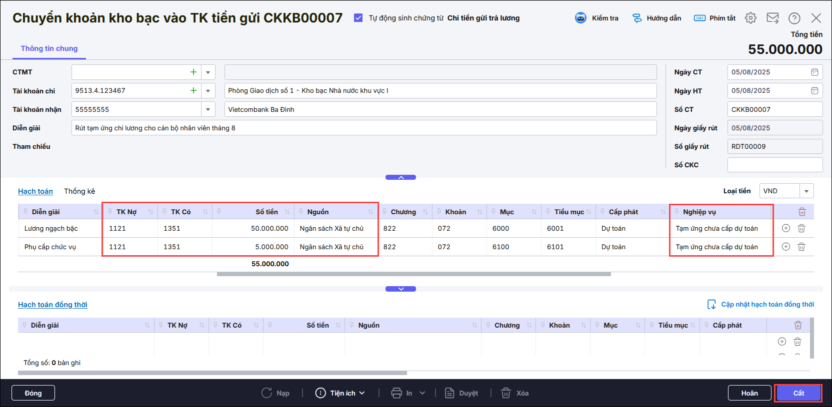 7. Nhấn Cất. Phần mềm tự động sinh chứng từ chi tiền gửi trả lương.