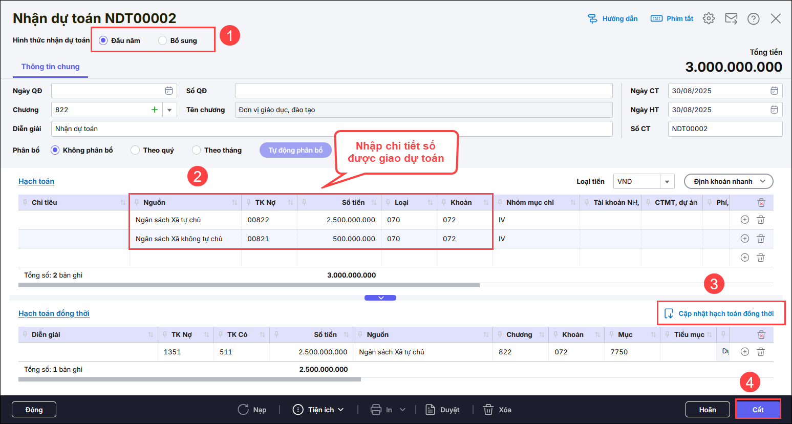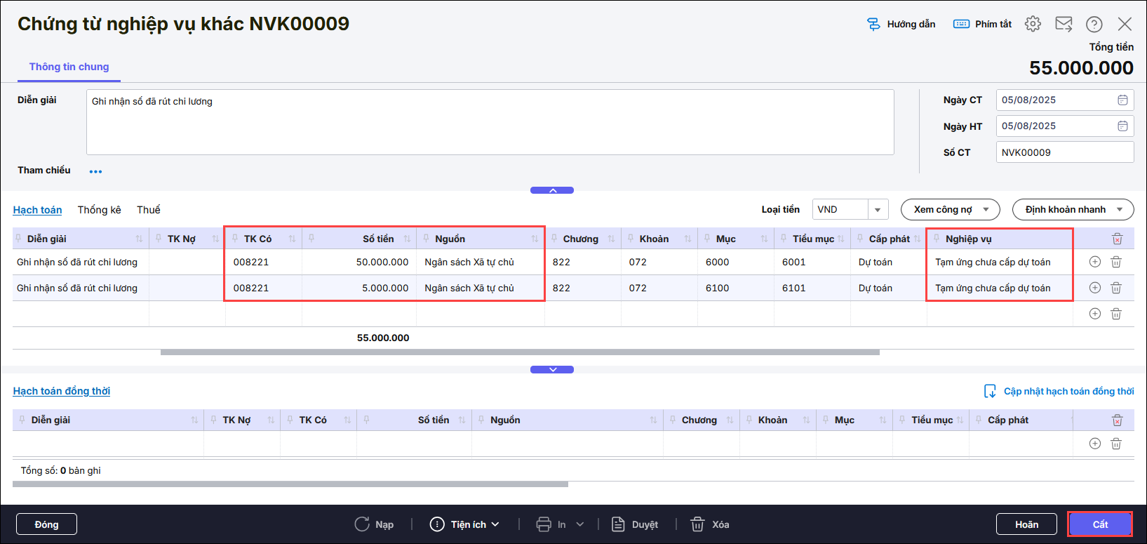 9. Nhấn Cất. Bước 2: Khi được giao dự toán chính thứcTrường hợp đơn vị được NSNN tạm cấp dự toán (trong thời gian chưa kịp giao dự toán chính thức), số tạm cấp dự toán chưa được hạch toán vào TK 008 (mà chỉ hạch toán vào TK trong bảng). Khi được giao dự toán chính thức, thực hiện như sau: 1. Lập chứng từ nhận dự toán để ghi nhận số dự toán chính thức được giao, xem chi tiết tại đây.