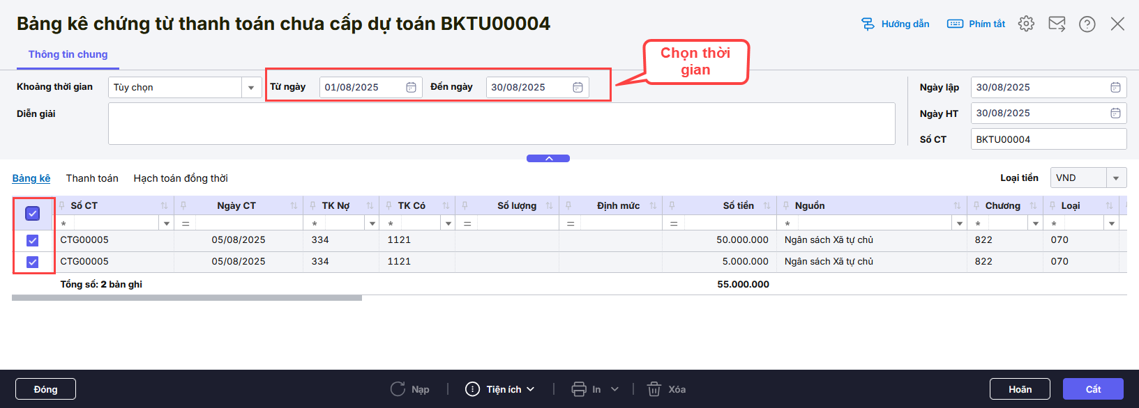 2. Chọn Khoảng thời gian cần lập bảng kê những chứng từ chi tạm ứng. 3. Nhập nội dung Diễn giải. 4. Tích chọn những chứng từ chi tạm ứng cần lập bảng kê.
