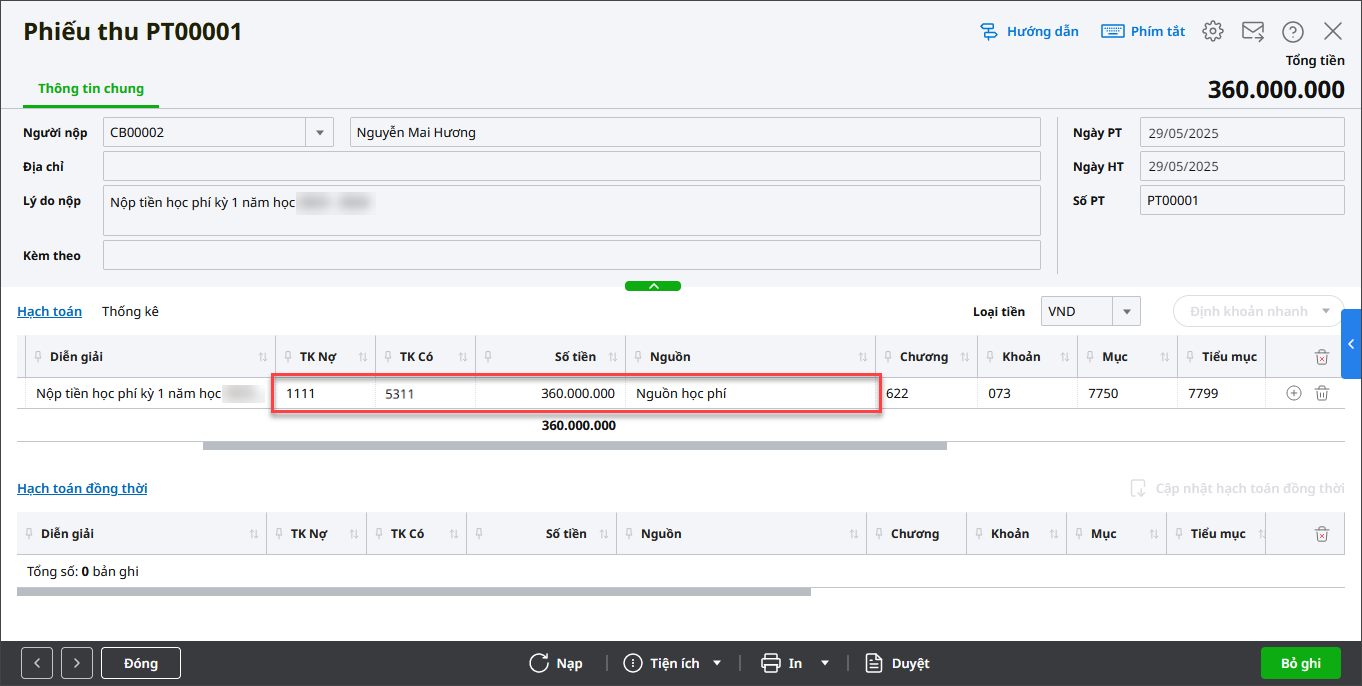 Ví dụ 1: Thu học phí học kỳ 1 năm học 2024 – 2025 bằng tiền mặt, số tiền: 360.000.000 đồng.