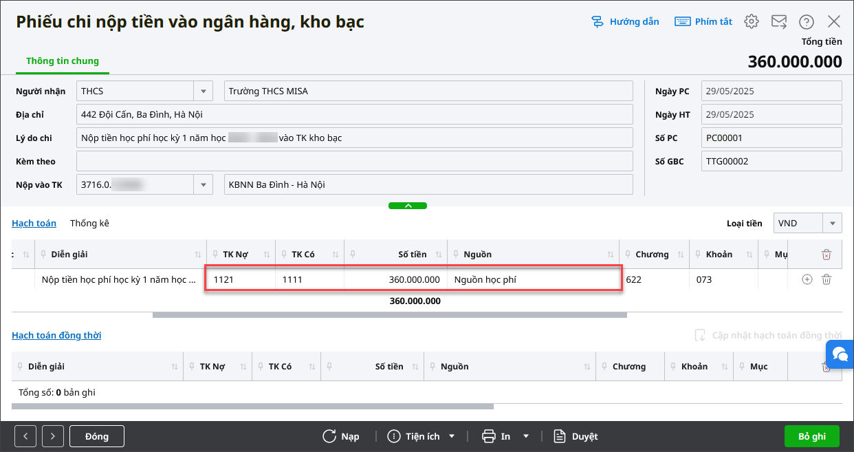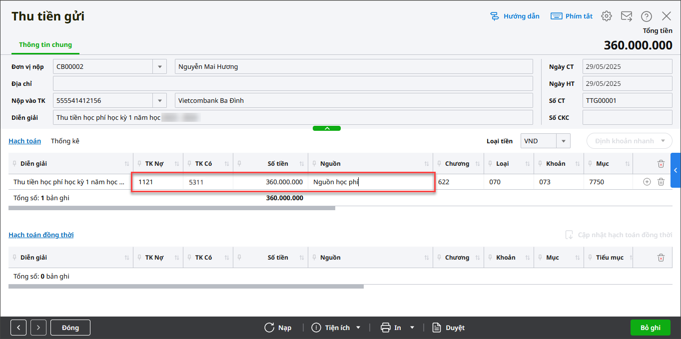 Ví dụ 2: Thu học phí học kỳ 1 năm học 2024 – 2025 bằng tiền gửi ngân hàng, số tiền: 360.000.000 đồng.