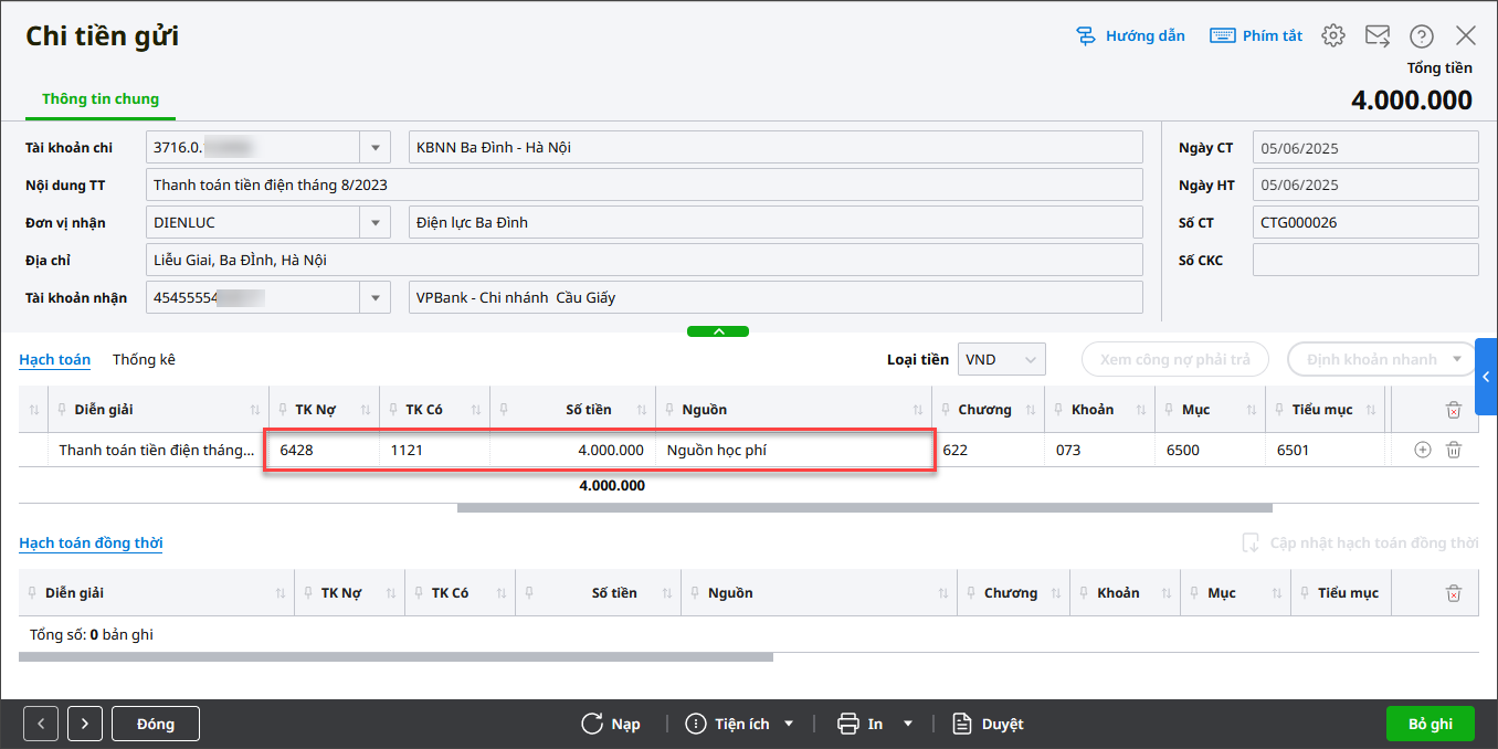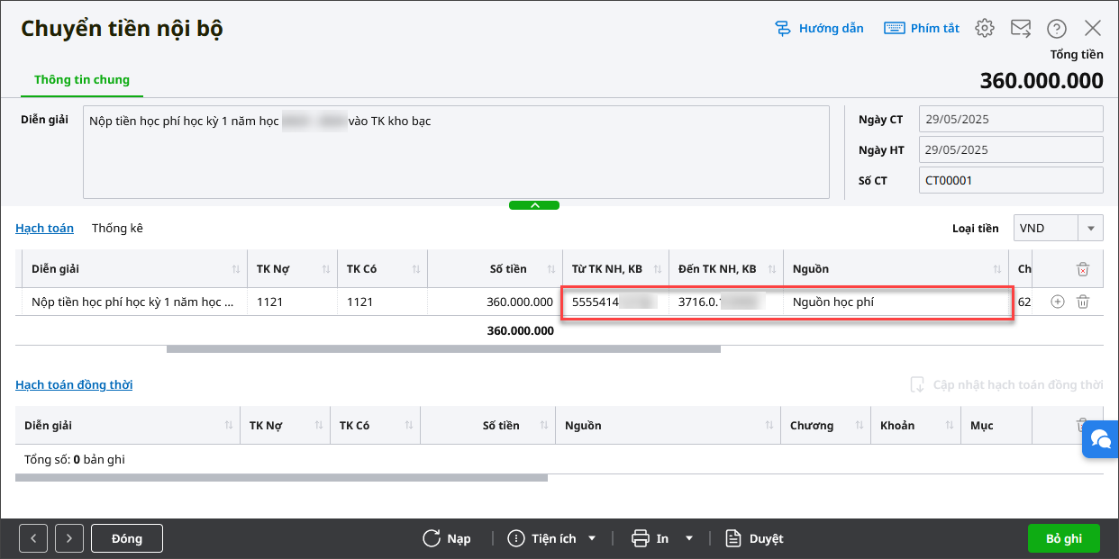 • Bước 2: Nhập TK Nợ 1121, TK Có 1121, Số tiền, Nguồn kinh phí: Nguồn học phí.