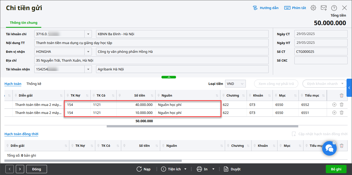 3. Ngày 29/05/2025, thanh toán tiền mua dụng cụ giảng dạy và học tập, số tiền: 50.000.000 đồng.