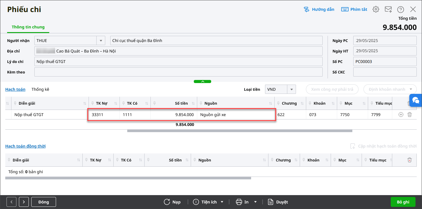 • Nộp bằng tiền gửi ngân hàng: Vào Tiền gửi\Chi tiền gửi.