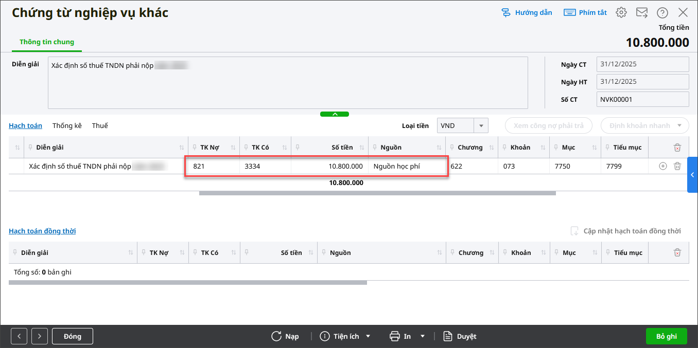 Vào Tổng hợp\Chứng từ NVK: Hạch toán Nợ TK 821/Có TK 3334, số tiền phải nộp