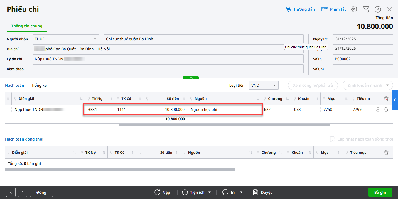 • Bước 2: Tại tab Hạch toán: định khoản TK Nợ 154/642, TK Có 1121/1111, Số tiền, Nguồn Nguồn học phí, Cấp phát Khác Nghiệp vụ Không chọn.