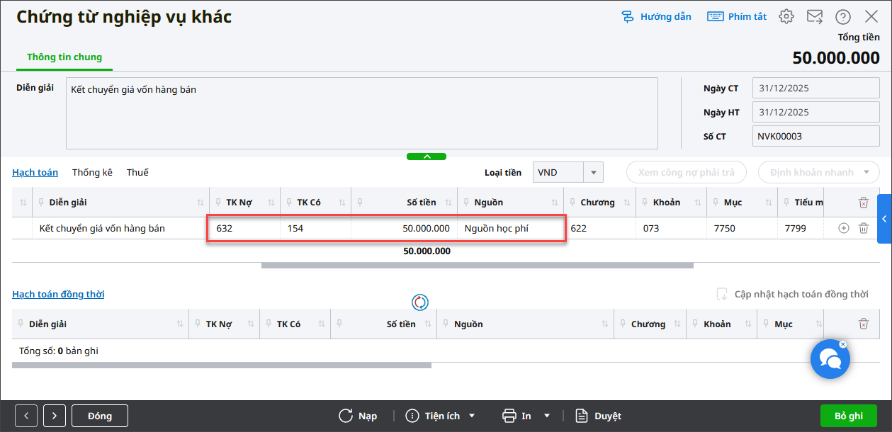 Ví dụ: Trên chứng từ mua dụng cụ giảng dạy và học tập, số tiền: 50.000.000 đồng: