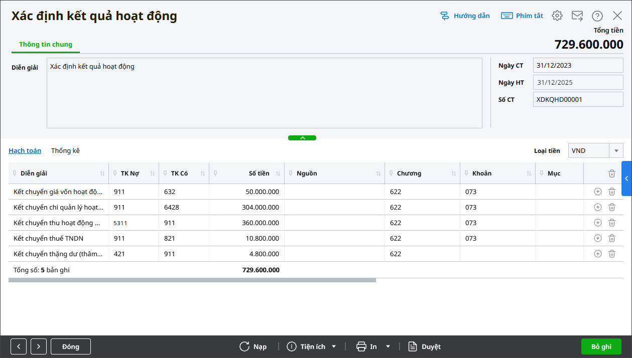 • Bước 2: Nhập ngày CT, ngày HT là ngày cuối kỳ. Phần mềm lấy lên các chứng từ kết chuyển tại màn hình Xác định kết quả hoạt động.