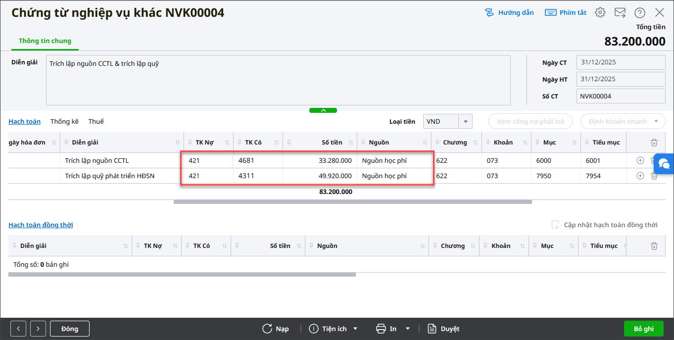 10. Ngày 31/12/2025, trích lập nguồn CCTL (40%) và quỹ phát triển hoạt động sự nghiệp (phần còn lại).