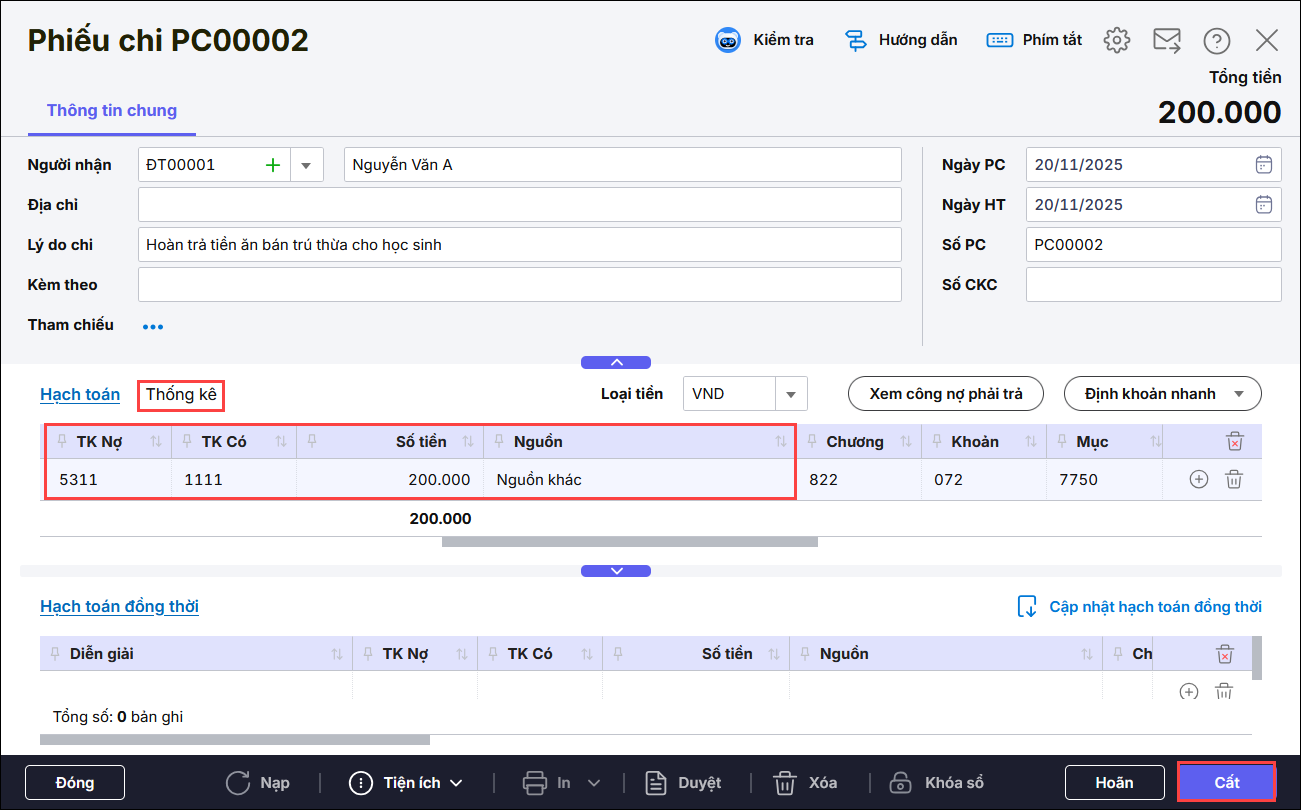 • Tại tab Hạch toán: định khoản TK Nợ 1111, TK Có 5311, Số tiền, chọn Nguồn tương ứng được khai báo ở danh mục Nguồn kinh phí: Nguồn Thu học phí, Cấp phát Khác, Nghiệp vụ Không chọn.