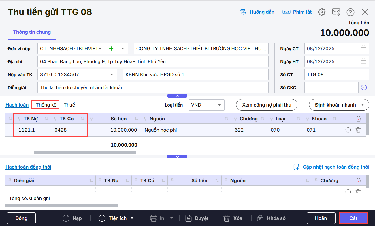 • Bước 2: Nhập TK Nợ 1121, TK Có 1111, Số tiền, Nguồn kinh phí: Nguồn học phí.