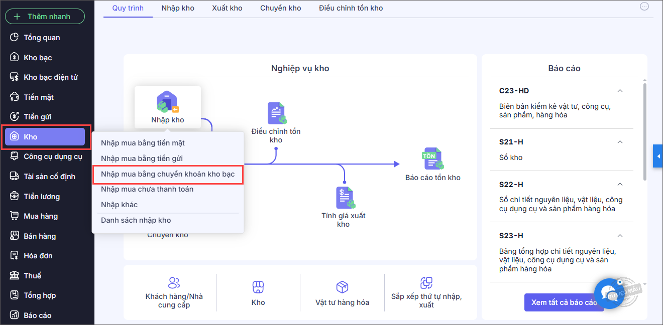 1. Vào nghiệp vụ Kho, chọn Nhập kho\Nhập mua bằng chuyển khoản kho bạc.