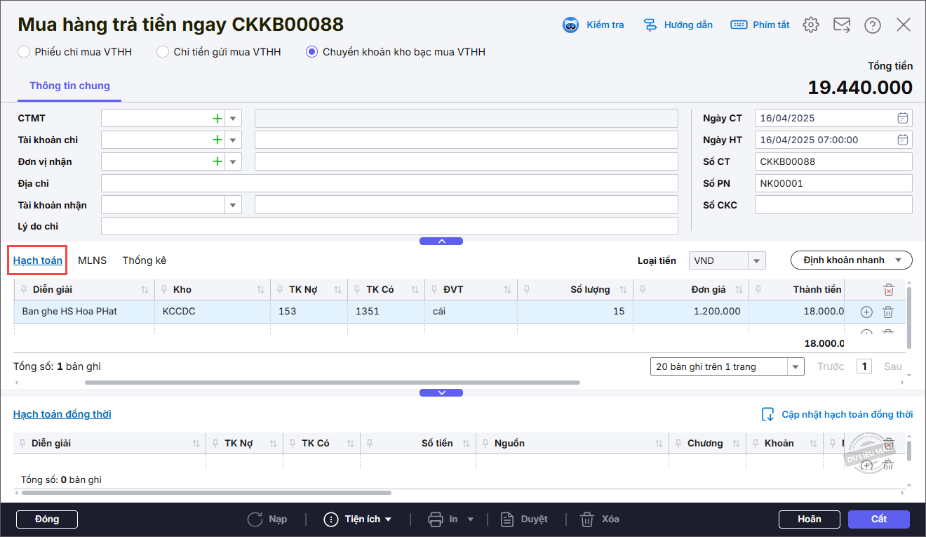 Bước 2: Lập chứng từ hạch toán mua CCDC/VTHH bằng chuyển khoản kho bạc
