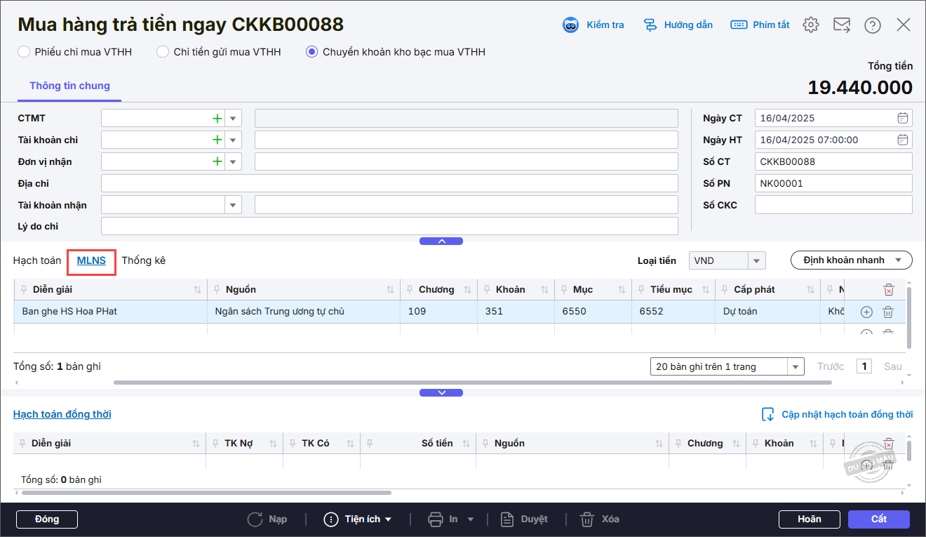 4. Chọn tab MLNS: Nhập Mục, Tiểu mục, Nghiệp vụ Thực chi.