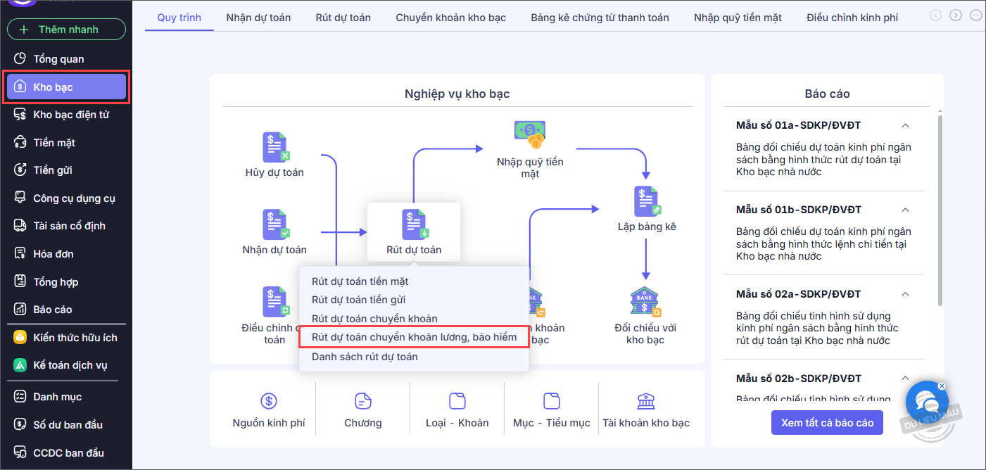 Bước 1: Vào nghiệp vụ Kho bạc\Rút dự toán\Rút dự toán chuyển khoản lương, bảo hiểm.