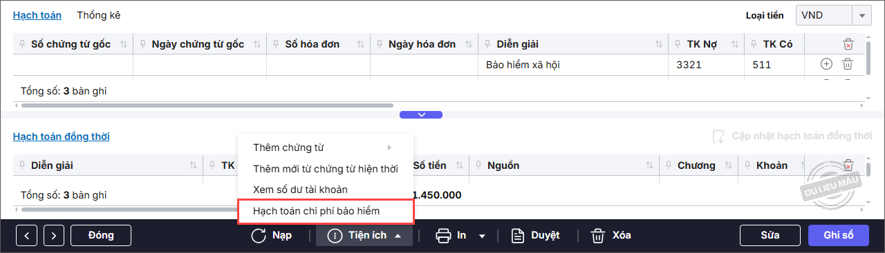 Lưu ý: Trường hợp không tích chọn Tự động sinh chứng từ Hạch toán chi phí bảo hiểm thì trên chứng từ, anh/chị vào Tiện ích\Hạch toán chi phí bảo hiểm để sinh chứng từ hạch toán chi phí.