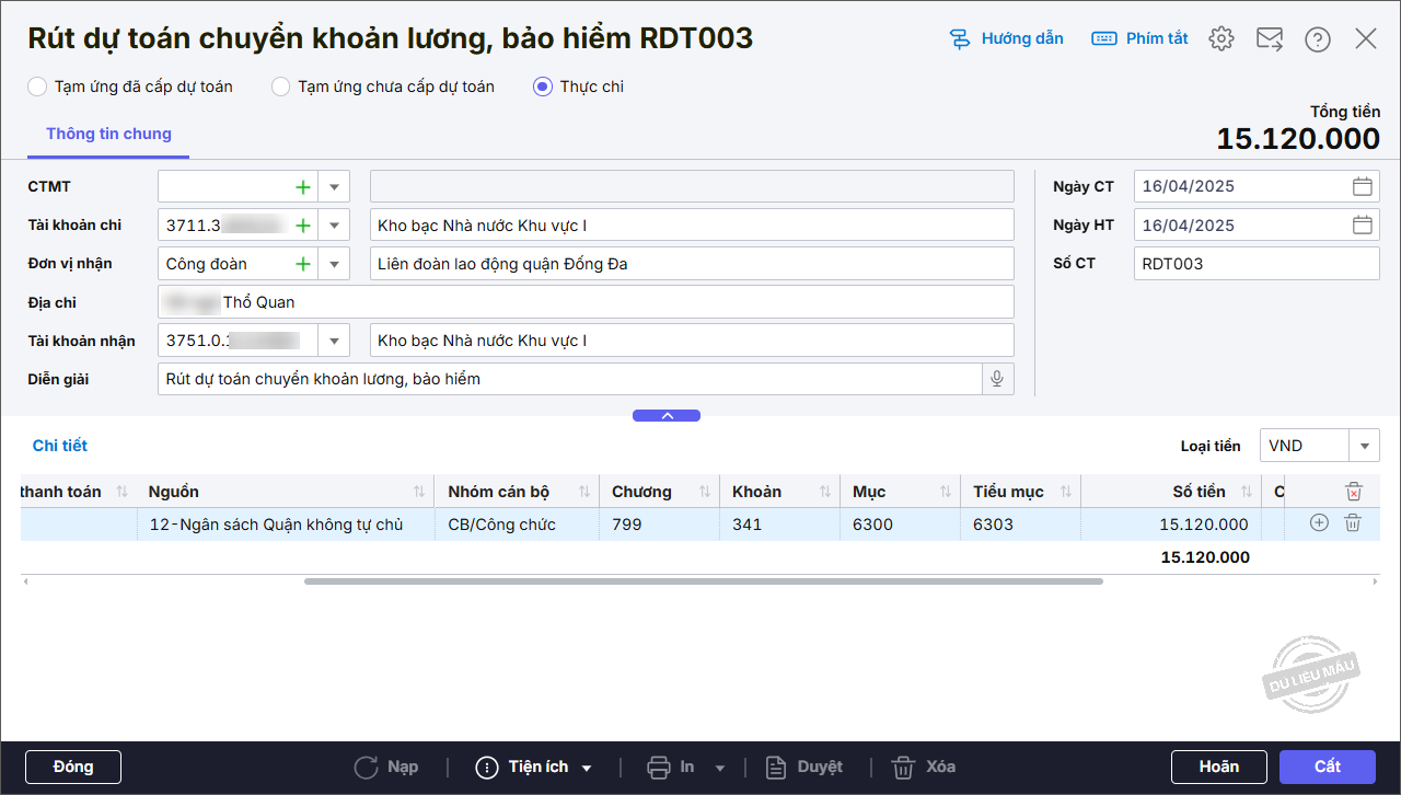 Để nhập chứng từ rút dự toán nộp kinh phí công đoàn trên phần mềm MISA iGOV Kế toán bạn làm như sau:
