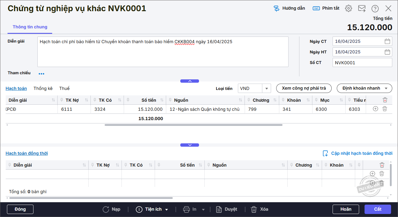 Bước 4: Anh/chị kiểm tra các thông tin trên chứng từ Chuyển khoản thanh toán bảo hiểm, phần mềm mặc định sinh hạch toán kế toán.