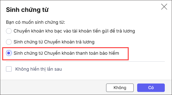 Bước 3: Nhấn Cất. Hệ thống hiển thị màn hình thông báo Bạn có muốn sinh chứng từ sau không? Tích chọn Sinh chứng từ Chuyển khoản thanh toán bảo hiểm. Nhấn Đồng ý.