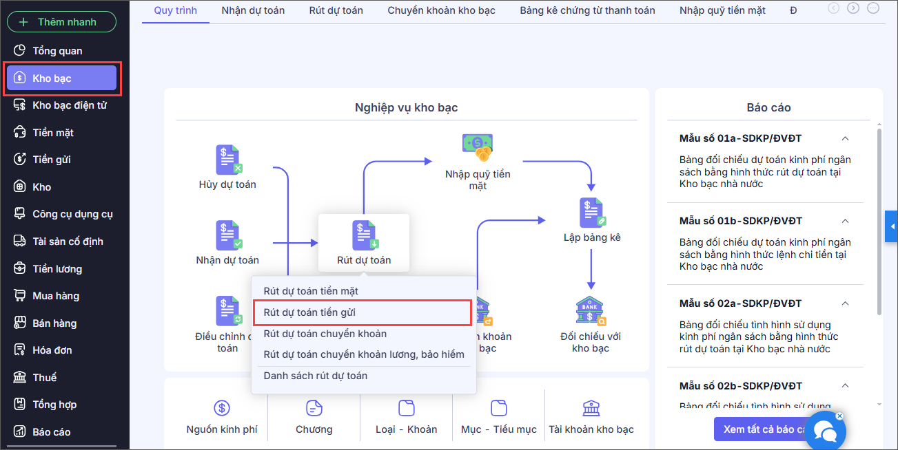 1. Vào nghiệp vụ Kho bạc\Rút dự toán\Rút dự toán chuyển khoản lương, bảo hiểm.