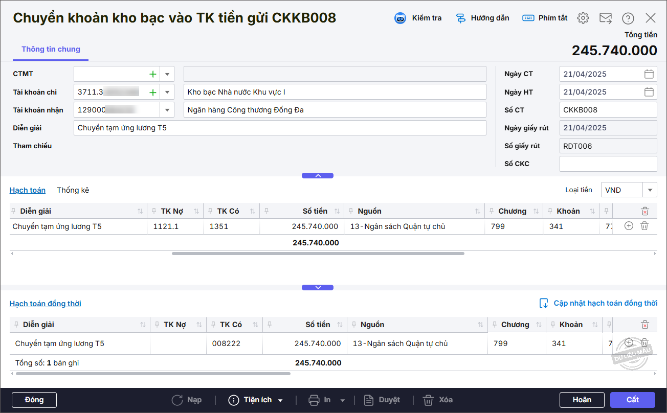 4. Bạn kiểm tra các thông tin trên chứng từ Chuyển khoản kho bạc vào TK tiền gửi, phần mềm đã tự sinh hạch toán Nợ TK 1121/Có TK 511, 1351 – nghiệp vụ Tạm ứng đã cấp dự toán dựa theo tính chất nguồn kinh phí đồng thời Có TK 008211 tương ứng.