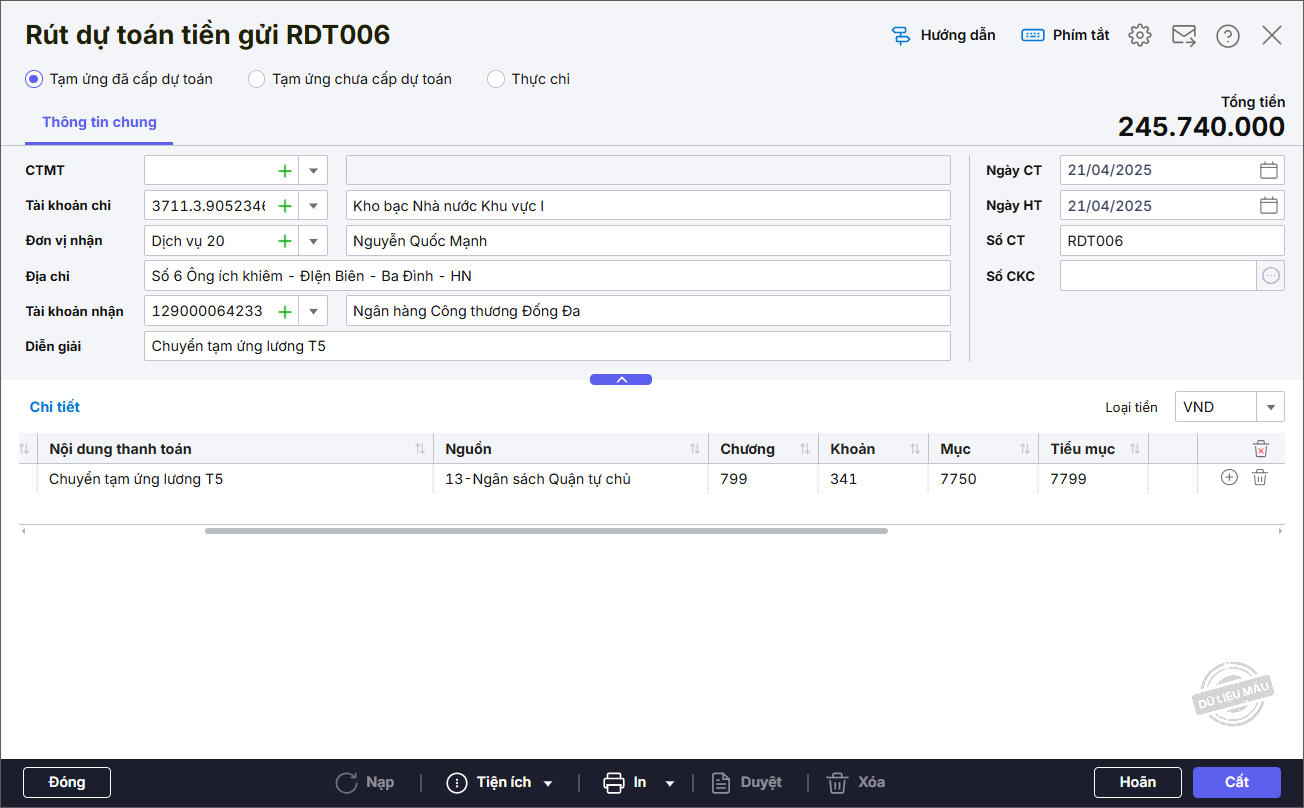 - Chọn hình thức: Tạm ứng đã cấp dự toán.