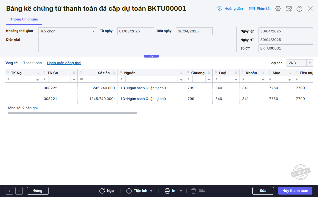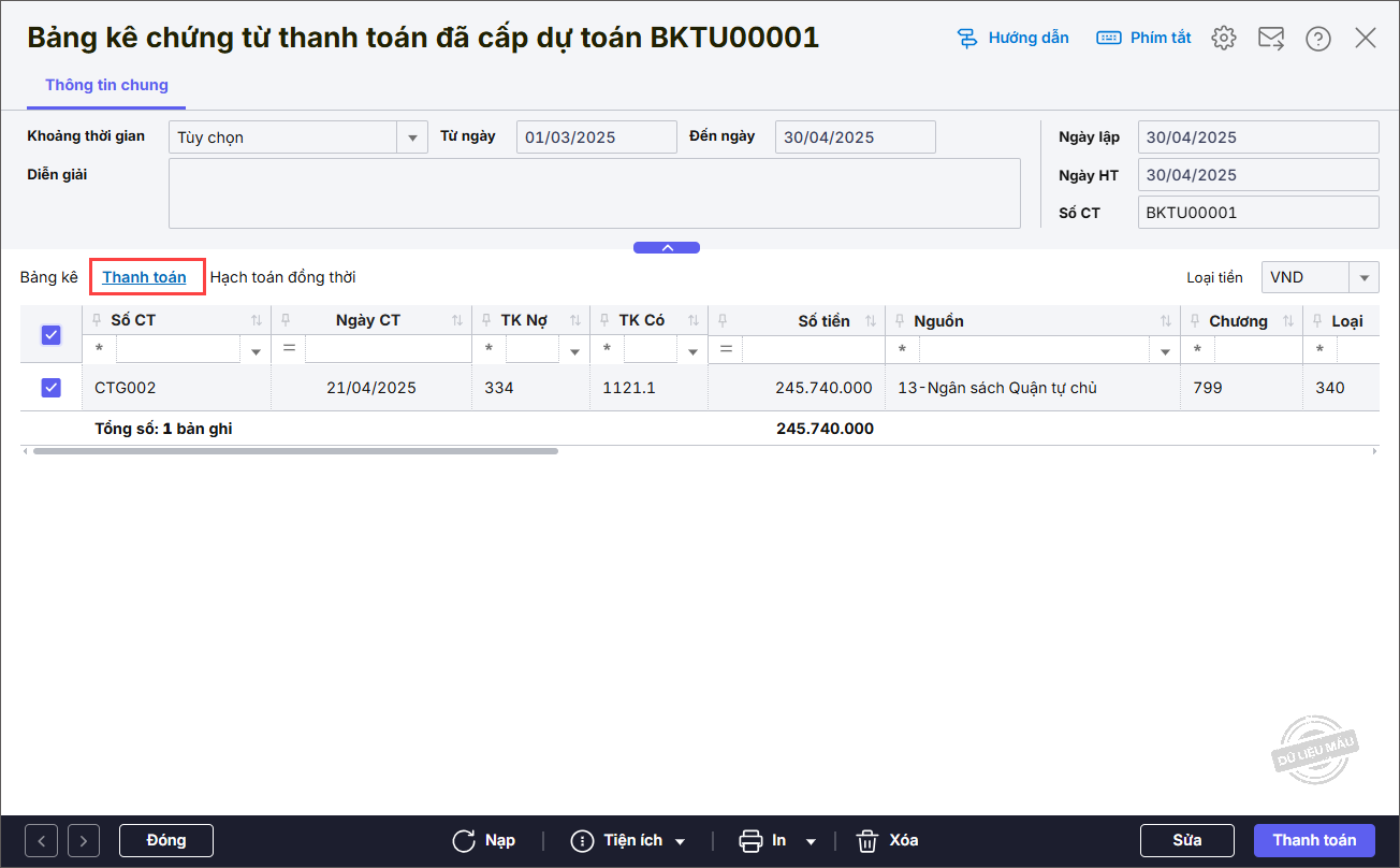 5. Sau khi thanh toán xong, phần mềm tự động hạch toán đồng thời tại tab Hạch toán đồng thời, ghi: