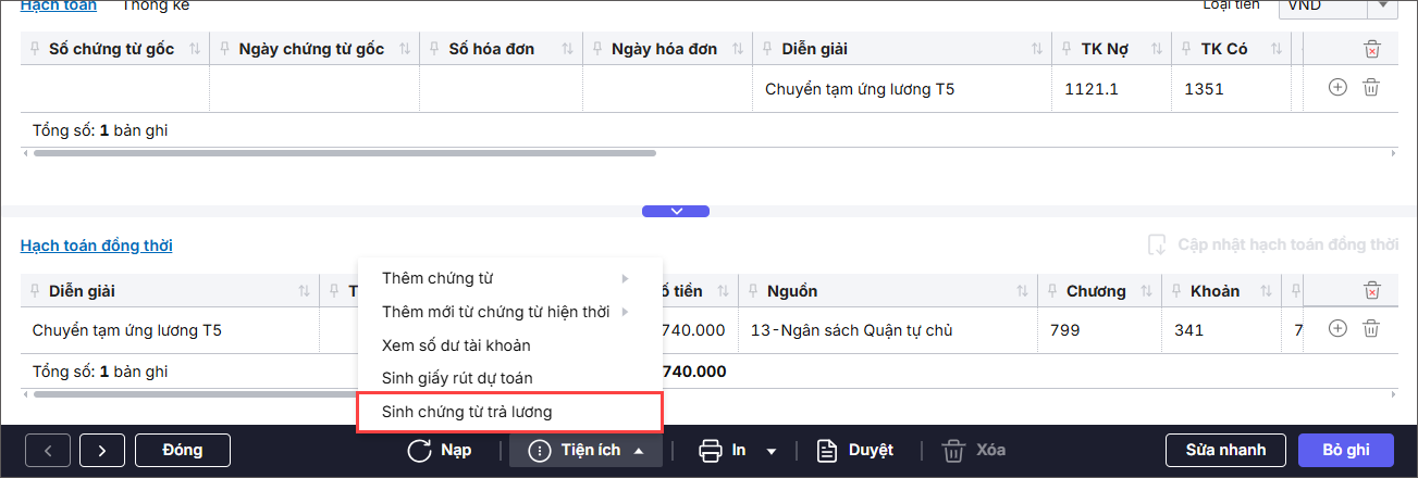 Lưu ý: Trường hợp không tích chọn Tự động sinh chứng từ Hạch toán chi phí lương thì trên chứng từ, bạn vào Tiện ích/Hạch toán chi phí lương để sinh chứng từ hạch toán chi phí.
