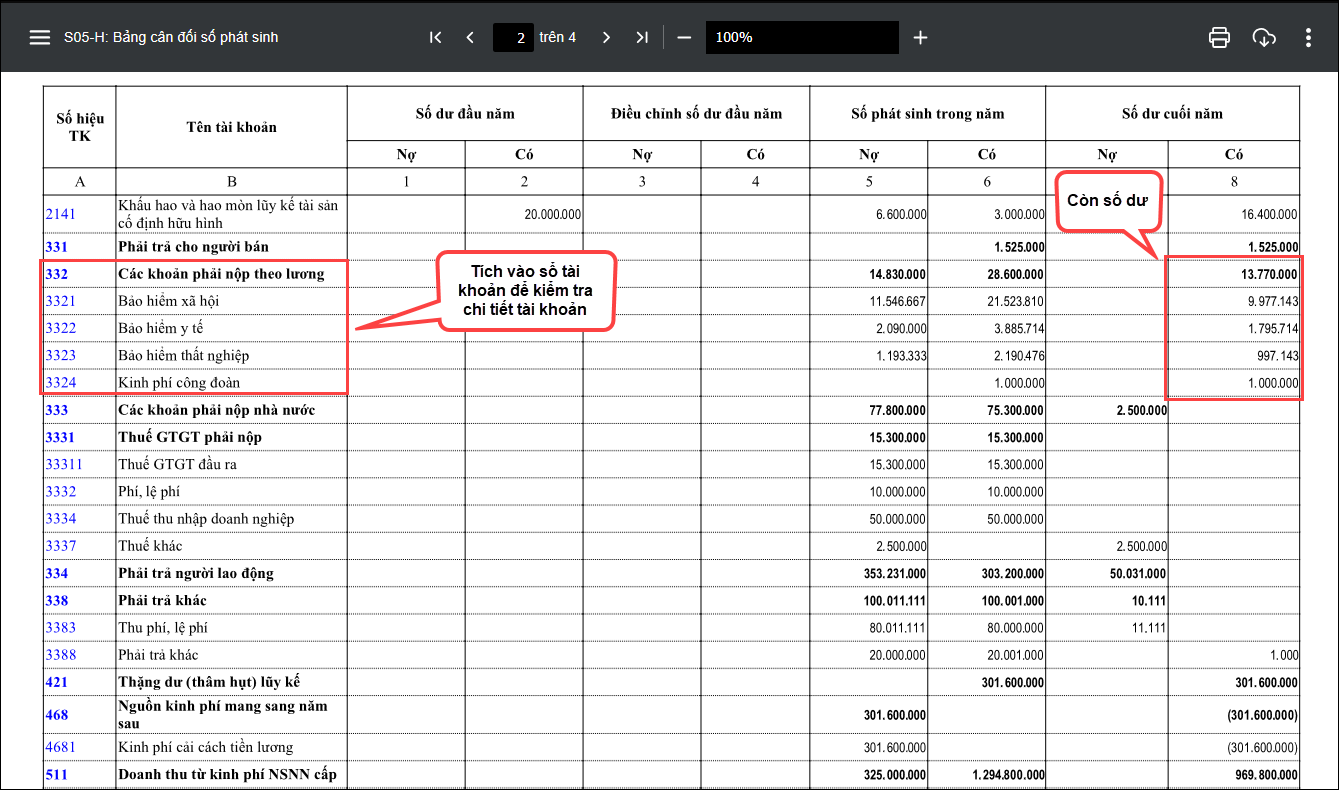 Khi xem báo cáo S05-H: Bảng cân đối số phát sinh vẫn còn số dư ở các tiết khoản tài khoản 332 bạn kiểm tra qua như sau: