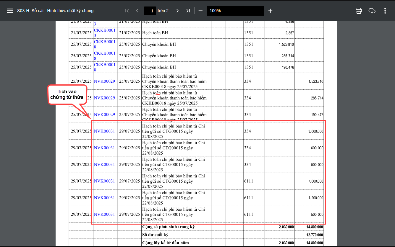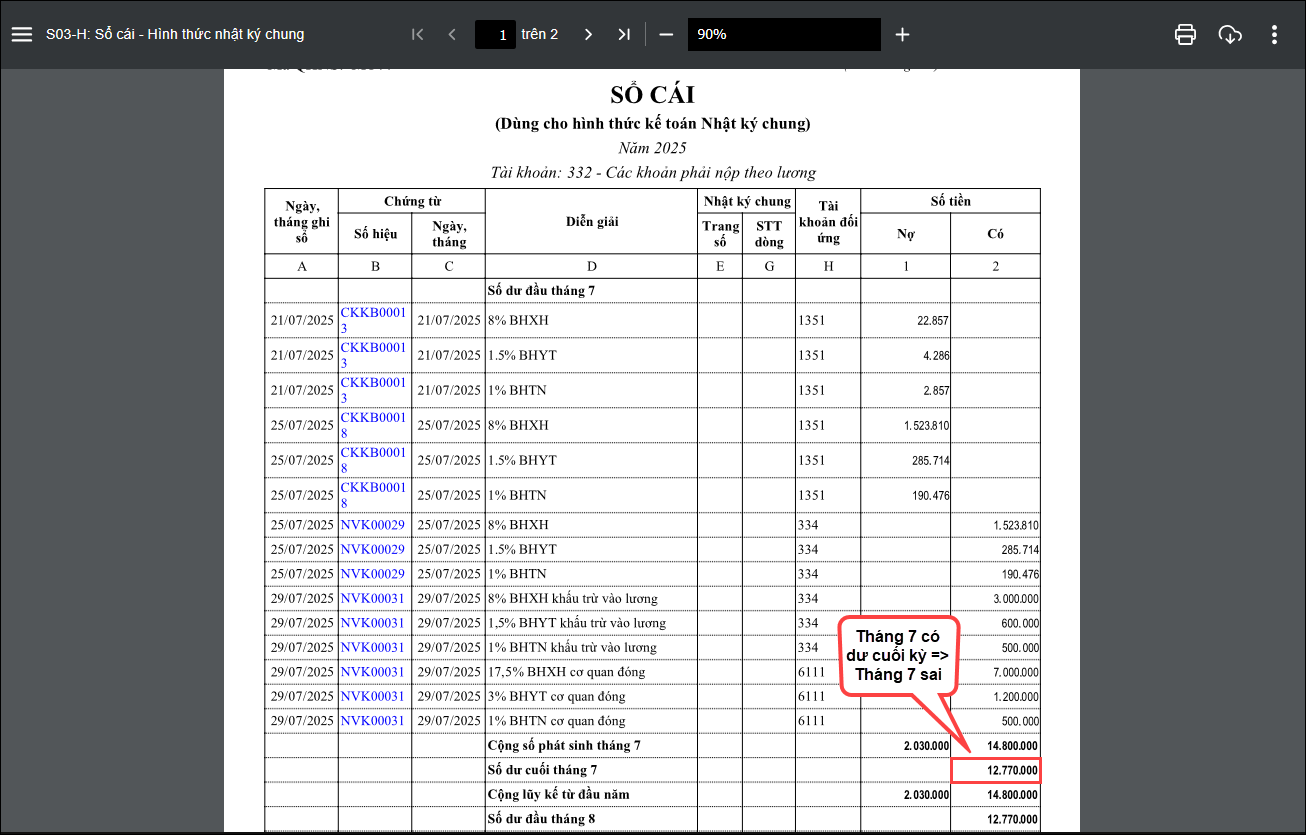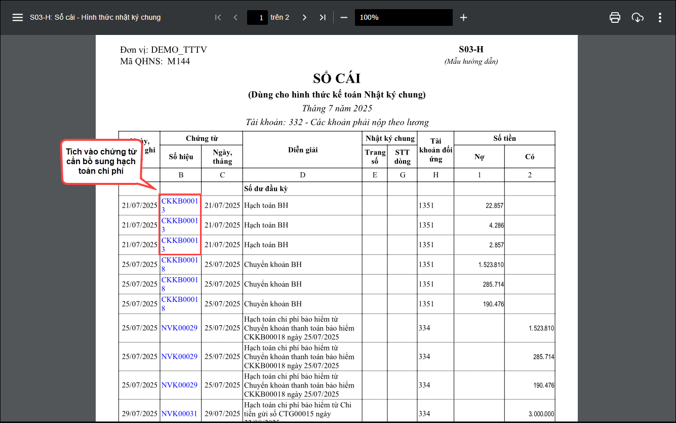 Tham khảo thêm tại đây Sau khi xóa số dư anh/chị in lại Bảng cân đối phát sinh theo hướng dẫn mục 2.2 để kiểm tra lại số dư 332 nếu còn dư thì thực hiện kiểm tra tiếp như sau: 2.3.2. Cách xử lý số dư cuối kỳ của tài khoản 332 Sau khi xóa số dư anh/chị in lại Bảng cân đối phát sinh theo hướng dẫn mục 2.2 để kiểm tra lại số dư 332 nếu còn dư số cuối kỳ thì thực hiện kiểm tra theo 2 trường hợp sau: Trường hợp 1: Số dư cuối kỳ của tháng dư bên Nợ * In sổ S03-H: Sổ cái – Hình thức nhật ký chung như sau :