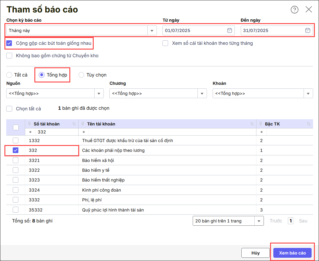 Bước 3: Tích chuột vào TK 332 tương ứng đang có số dư cần kiểm tra Bước 4: Kiểm tra số dư TK 332 đang dư ở tháng nào