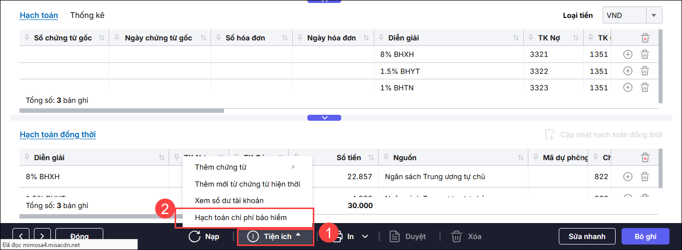 Lưu ý : Nếu sau khi tích phần mềm có cảnh báo Đồng bộ chứng từ để đồng bộ lại chứng từ nghiệp vụ khác( Chứng từ hạch toán chi phí bảo hiểm )đã có thì anh/chị thực hiện :
