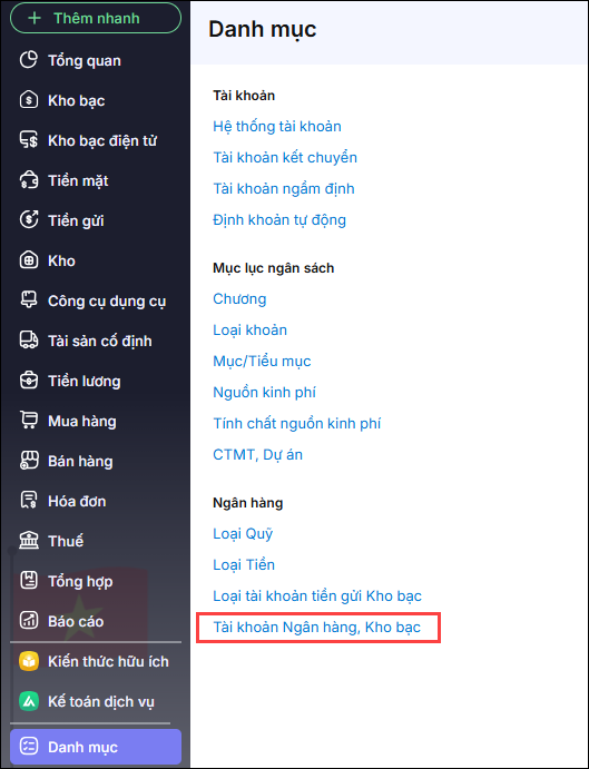 Bước 1: Vào menu Danh mục/Tài khoản ngân hàng, kho bạc