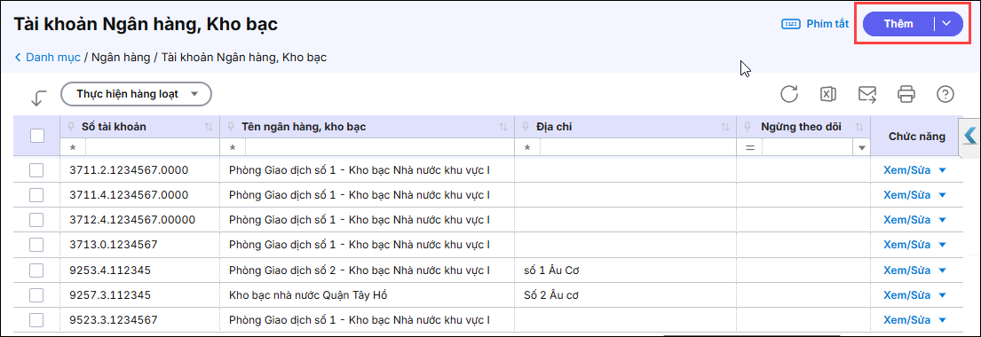 Bước 2: Nhấn Thêm để khai báo thông tin tài khoản ngân hàng, kho bạc.
