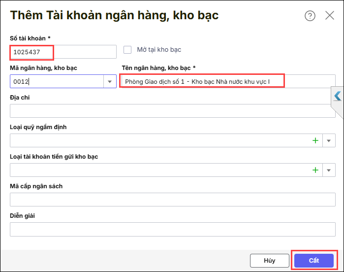 2.2. Nếu không thấy tài khoản ngân hàng, kho bạc thì thêm mới tài khoản ngân hàng, kho bạc