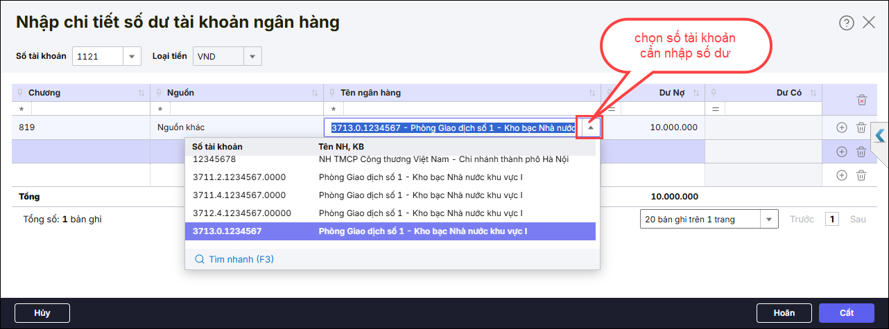 Bước 2: Nhập số dư cho từng tài khoản ngân hàng, kho bạc.